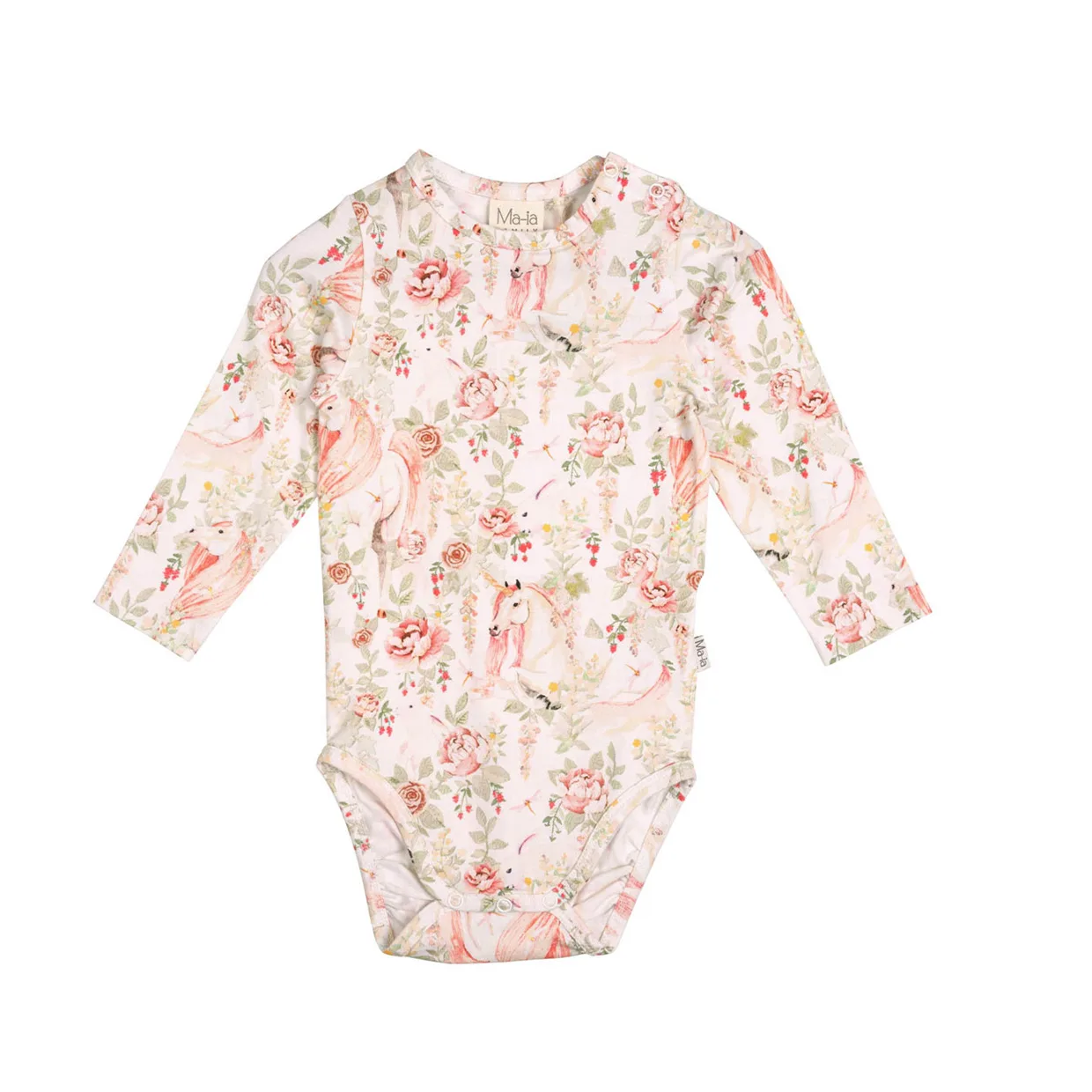 Bodyn har långa ärmar som värmer skönt och är utrustad med praktiska tryckknappar på ena axeln och i grenen, vilket gör av- och påklädningen smidig. Den har dessutom gott om plats för blöjan, så att barnet kan röra sig fritt och bekvämt hela dagen.