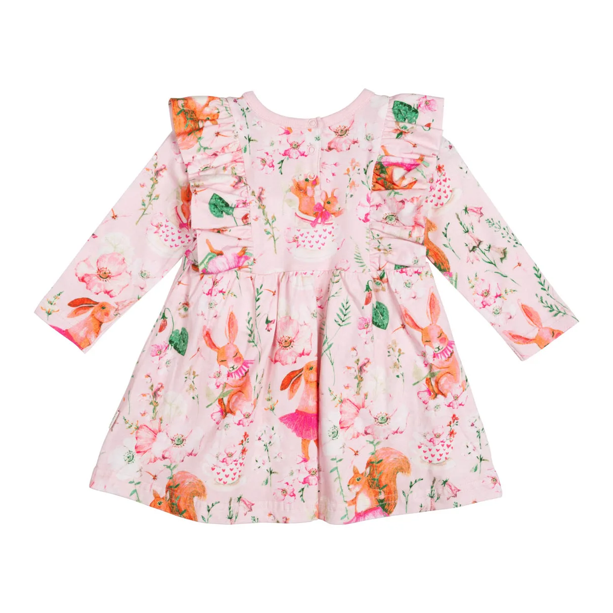 Klänningen har långa ärmar, en rund halsringning och söta volangdetaljer som ger ett lekfullt och charmigt uttryck. De praktiska knapparna i ryggen gör den enkel att ta av och på – perfekt för smidiga ombyten.