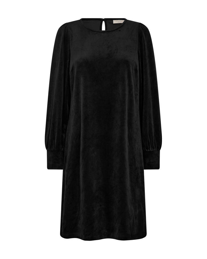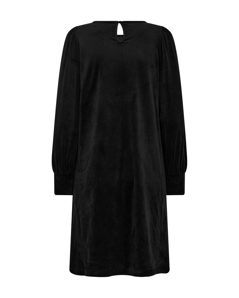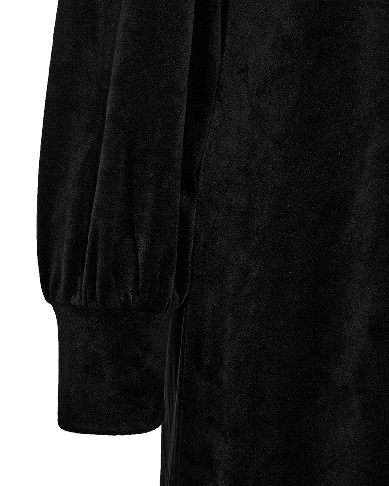 Elegant sammetsklänning med rund halsringning, lång ärm och bredare mudd i ärmsluten. Perfekt att klä upp med en stövel och tights till vinterns festligheter!