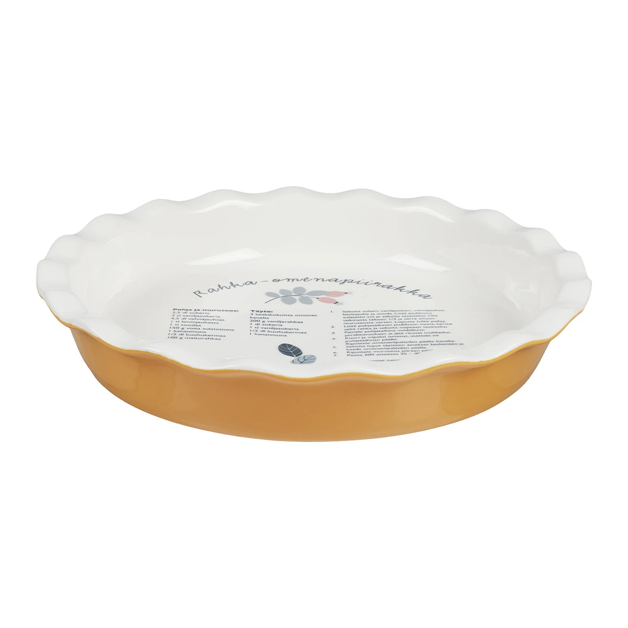 En rund pajform i keramik som gör din matlagning lite mer kreativ. Insidan av formen har ett äppelpajsrecept på finska och fina höstiga illustrationer medan utsidan är en vacker ockra. Formen är 25 x 4,5 x 25 cm och tål diskmaskin, ugn och mikrovågsugn.